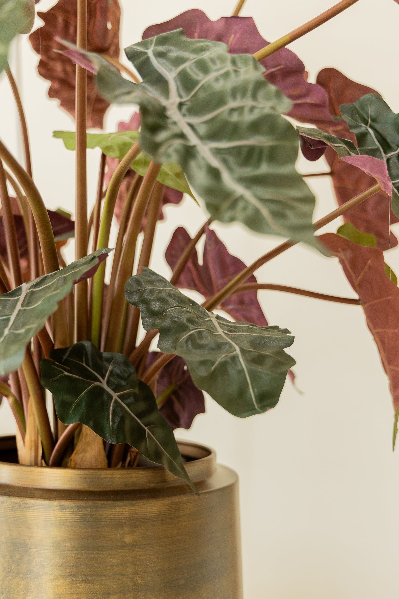De combinatie van structuur, kleur en gelaagdheid geeft deze plant die herkenbare tropische uitstraling. Zelfs van dichtbij zie je nauwelijks verschil met een echte Alocasia, maar je geniet wel van het gemak van een onderhoudsvrije kunstplant.