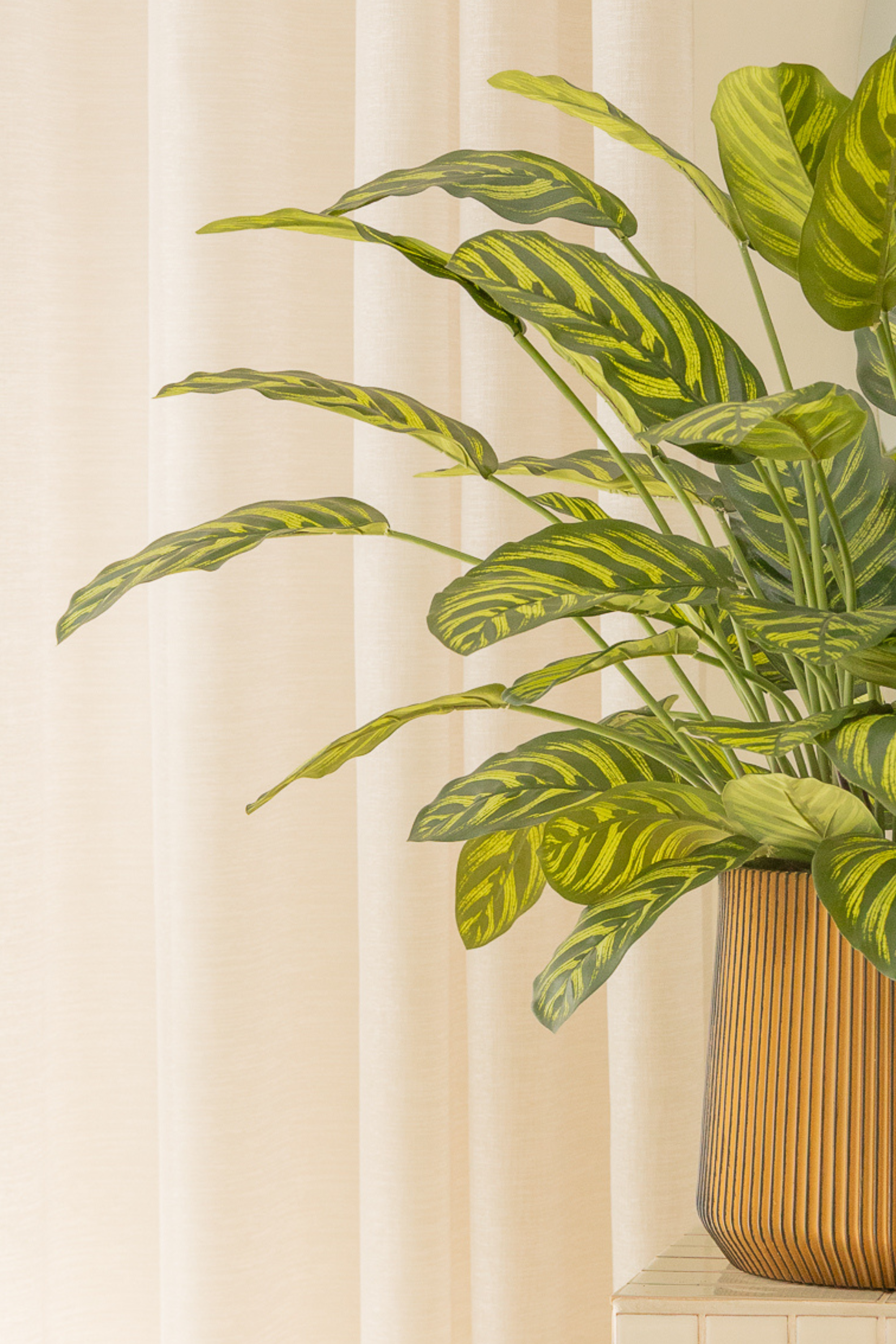 De Calathea kunstplant is een echte blikvanger dankzij zijn diepgroene bladeren met opvallende lichtgroene nerven. Elk blad heeft een unieke tekening, waardoor de plant een levendige, natuurlijke uitstraling krijgt. De fijne bladstructuur en subtiele glans zorgen ervoor dat hij zelfs van dichtbij nauwelijks van echt te onderscheiden is.