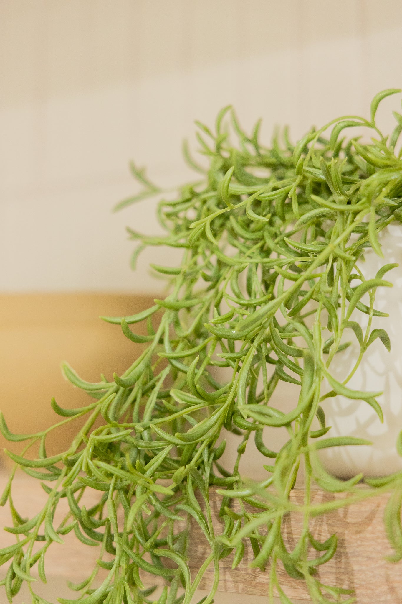 De Rozemarijn kunsthangplant is met oog voor detail ontworpen. De dunne, sierlijke takjes hebben een natuurlijke buiging, waardoor ze soepel naar beneden vallen. De blaadjes zijn verfijnd gevormd, smal, licht glanzend en met subtiele kleurverschillen. Dat zorgt voor een levendige, natuurlijke uitstraling.