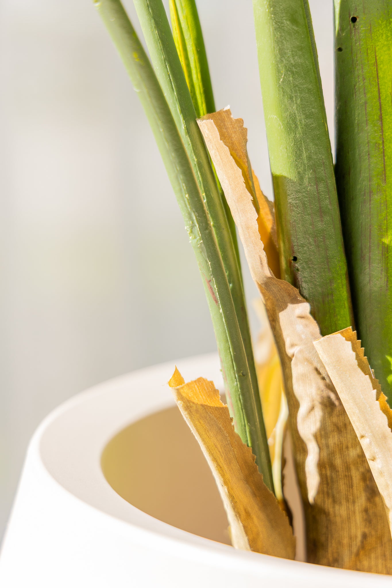 De stam van deze kunst Strelitzia is ontworpen met realistische details: van de frisgroene kleur met natuurlijke nerven tot de subtiele bruine accenten die zorgen voor een levensecht effect. Ook de droge, beige bladscheden rondom de stam zijn toegevoegd, precies zoals je die bij een echte Strelitzia ziet.