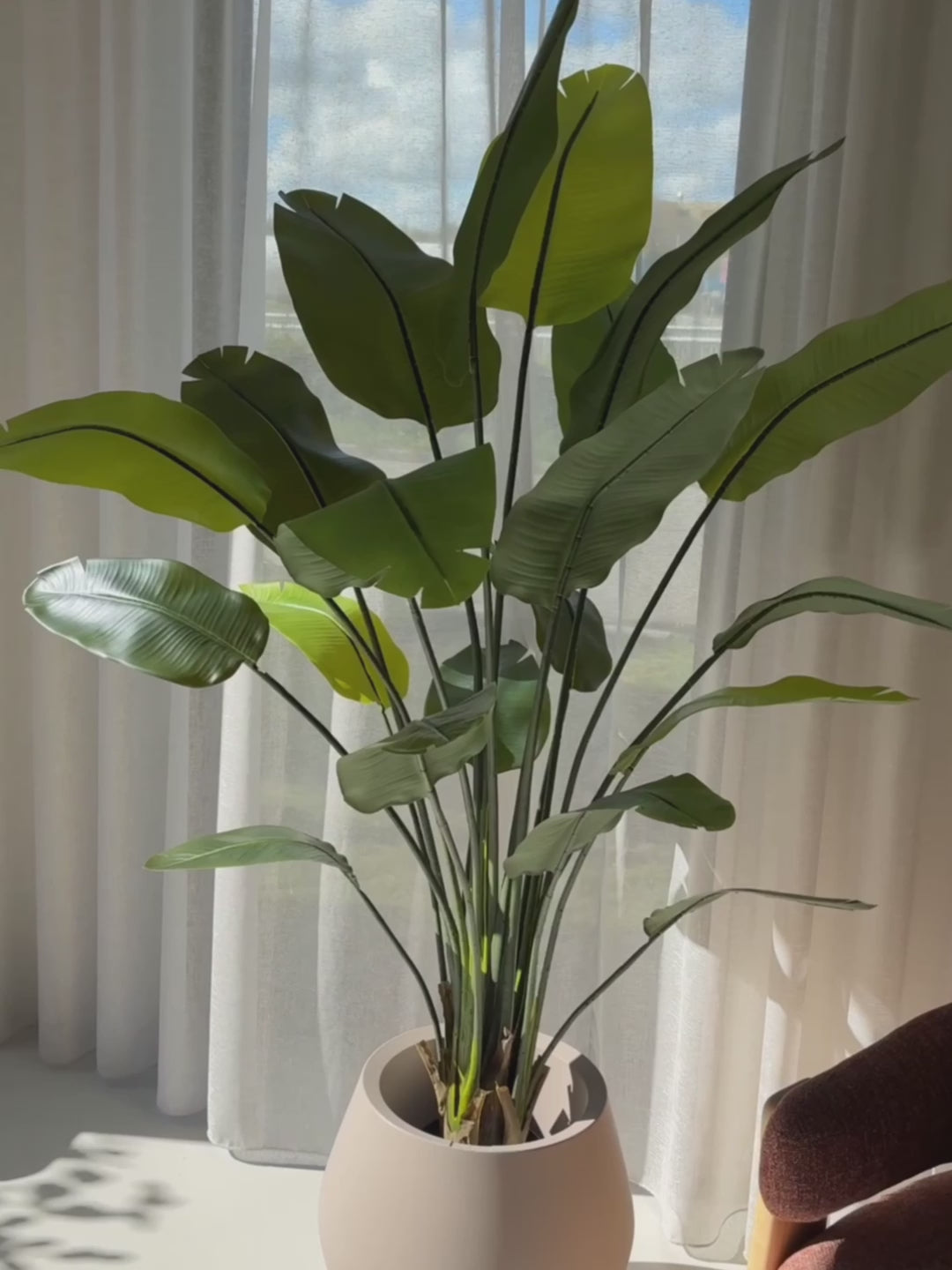 Met zijn hoogte van 180 cm is deze kunst Strelitzia een echte statement plant. Hij brengt direct een tropische sfeer in huis en is groot genoeg om een lege hoek om te toveren tot een stijlvol middelpunt.