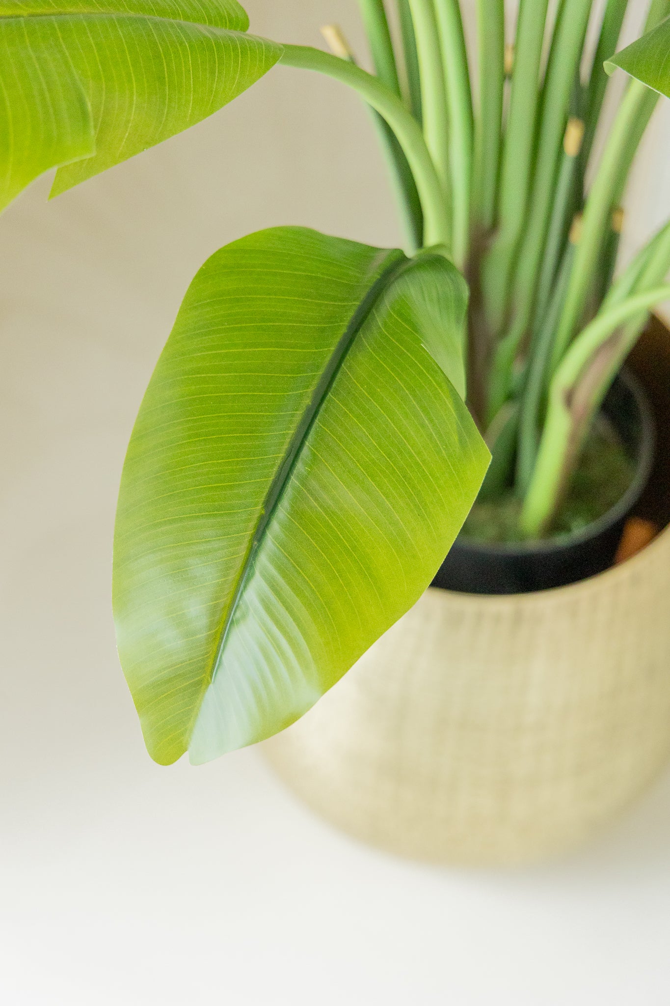 De Strelitzia is zó natuurgetrouw nagemaakt dat hij zelfs van dichtbij nauwelijks van echt te onderscheiden is. De subtiele kleurovergangen in blad en stam geven de plant die authentieke jungle-look, alsof je een stukje tropen in huis hebt gehaald.